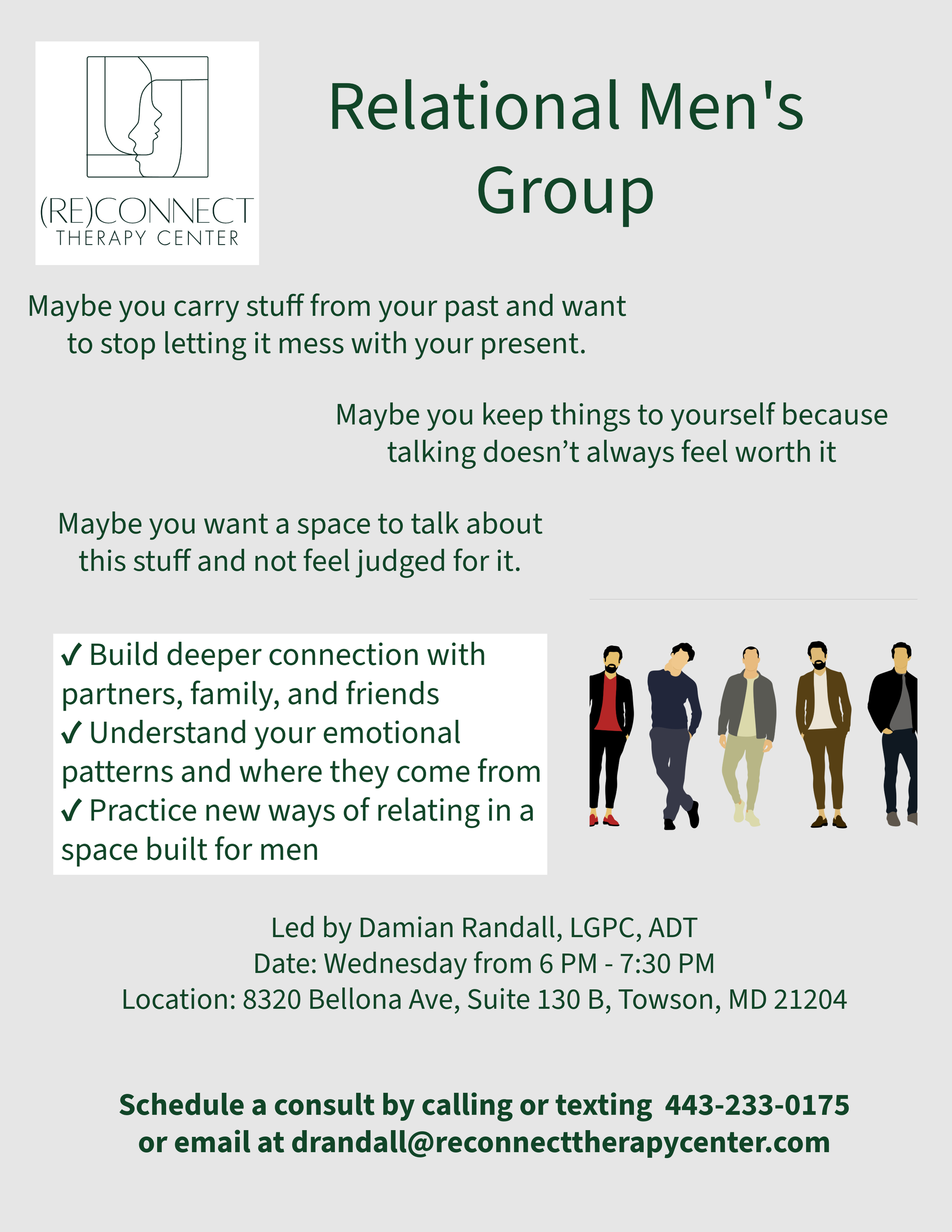 Relational Men’s Group Wednesdays 6pm-7:30pm New 8-Week Cycle Begins on 2/11/2026Fee: $50/group session Get Started